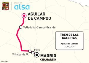Bajo el nombre de “Tren de las Galletas” -vinculado a la fama de su industria confitera-, saldremos de la estación de Madrid-Chamartín a primera hora de la mañana del sábado, 21 de junio. Tras recoger viajeros en las estaciones de Pitis y Villalba de Guadarrama, nos iremos incorporando a la