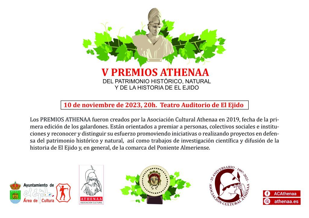 09/04/2021La Asociación Cultural Athenaa convoca los III Premios Athenaa del Patrimonio Histórico, Natural y de Historia de El Ejido-2021 Podrán optar a los Premios ATHENAA instituciones públicas o privadas, colectivos, entidades o personas físicas o jurídicas que hayan destacado en la investigación, la salvaguarda y/o la difusión del Patrimonio Histórico, Natural o al conocimiento de la Historia de El Ejido. La concurrencia podrá ser por iniciativa propia o a propuesta de otras entidades o personas. El plazo de presentación de candidaturas será del 1 de abril al 30 de junio de presente año. El jurado valorará: El esfuerzo investigador y divulgador del patrimonio. Las aportaciones técnicas y científicas de nuestro pasado histórico. La aportación de un mayor valor histórico patrimonial