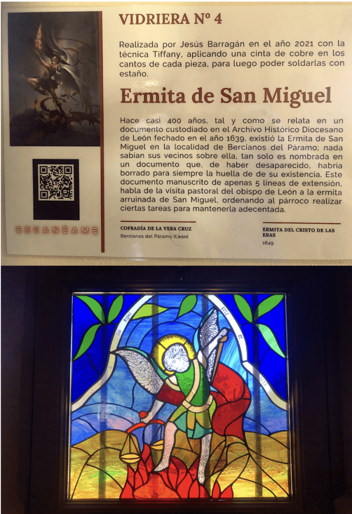 VIDRIERA Nº 4. Con esta vidriera queremos recordar la existencia de otra ermita que existió en Bercianos del Páramo, de cuya existencia solo sabemos a través de la localización de un documento del siglo XVII. El contenido de ese documento podrás descubrirlo en este enlace al audio.https://podcasts.apple.com/gr/podcast/la-desaparecida-ermita-de-san-miguel-de-bercianos/id1530856334?i=1000519621292