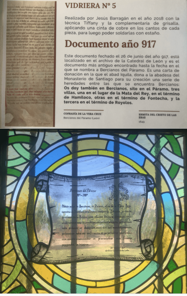 VIDRIERA Nº 5.  Con esta vidriera queremos dejar plasmado el documento mas antiguo hasta la fecha que habla de nuestro pueblo, entre otros. Se trata de un documento custodiado en el archivo de la catedral de León, fechado el 26 de junio del año 917. Es una carta de donación del abad Iquila a la abadesa del desparecido Monasterio de Santiago, para la creación de este último. Sabemos gracias a este escrito, que Bercianos del Páramo, al igual que los que se nombra en el documento, ya existía hace más de 1.100 años.