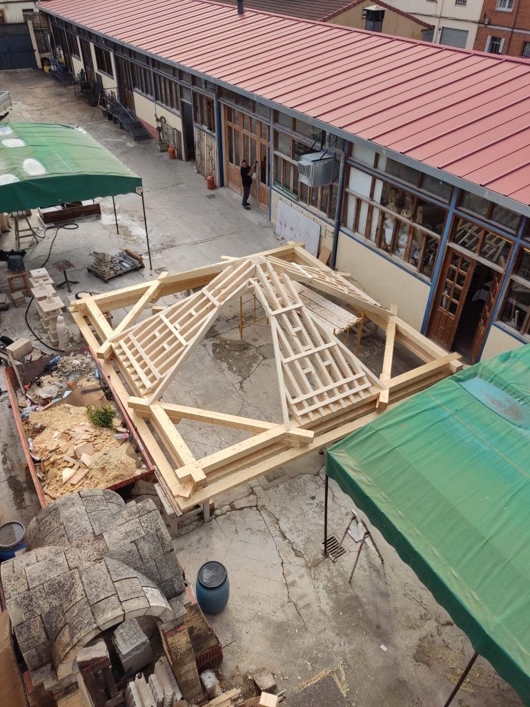 Esta aventura que comenzamos hace casi un año va a completarse, una iniciativa fraguada con mucha ilusión hecha realidad. Las tejas de los mecenas con sus nombres grabados en láser por fin van a reposar sobre esta estructura decorativa de estilo medieval que representa el buen hacer de los carpinteros y aprendices de toda España que realizaron el Curso de Carpintería de Armar este verano en el Centro de los Oficios de León, situado en Puente Castro (León). https://www.instagram.com/reel/DNTBvaPIHBN/?igsh=Nm9xYm9jOHp1ODNi LA ARMADURA QUE ALBERGARÁ LA TEJAS GRABADAS PARA LA ERMITA DE BERCIANOS DEL PÁRAMO (LEÓN) A PIE DE ERMITA
