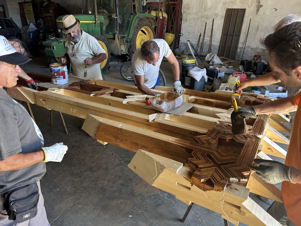Esta mañana hemos comenzado el tratamiento de toda la madera que va a conformar la estructura de soporte y decorativa del nuevo tejado que alojará las tejas grabadas con los nombres de los mecenas. En esta fase contamos con la supervisión del carpintero Fran Zabbek, que será también el encargado del montaje final de la armadura.