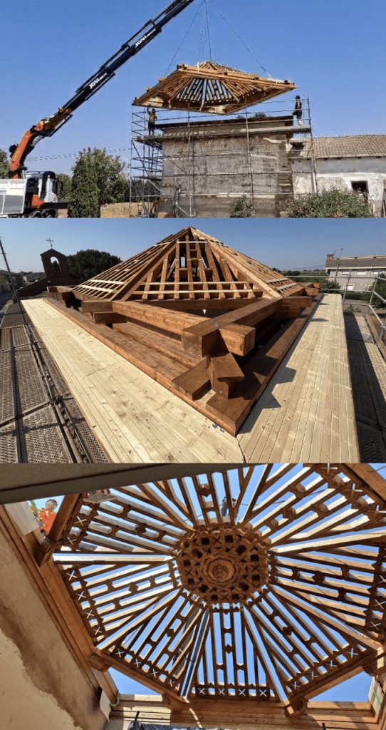YA TENEMOS MONTADA LA ESTRUCTURA SOBRE EL PRESBITERIO DE LA ERMITA PARA PONER LAS TEJAS DE NUESTROS GRANDES MECENAS