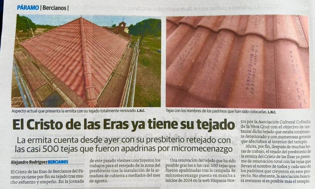El Centro de Oficios y Artes Plásticas de León comienza el curso de verano en el que se construirá una armadura del presbiterio para el templo y proceder después a la instalación de las tejas apadrinadas. https://www.lanuevacronica.com/actualidad/tejado-ermita-bercianos-paramo-cada-dia-mas-cerca-ser-realidad_178338_102.html?fbclid=IwY2xjawLTLiFleHRuA2FlbQIxMQBicmlkETBqZGE1WkdDS1VYUERTRFdwAR6M7zCIZ0k38cgV4xJSQ_YRKxxq8p9IfxOEu2Fz5vEyuZU02GSfxBuAJogR7Q_aem_ICYbpOEjFdIPOiCryY7o_Q La ermita del Cristo de las Eras de Bercianos del Páramo ve cada día más cerca la restauración y renovación de su tejado. Tras lograr el primer objetivo de recaudar los fondos necesarios a través de la campaña de micromecenazgo de apadrinamiento de tejas, con la que logró un total 25.281 euros, la Asociación Cultural Cofradía de la Vera Cruz puso en marcha otro proyecto para acometer una restauración «más