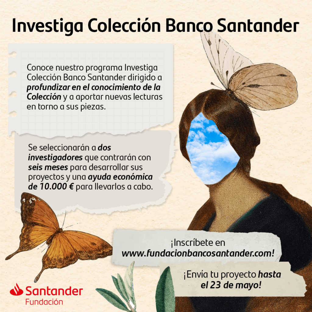 11/05/2023Te presentamos la 2ª edición de Investiga Colección Banco Santander, dirigida a investigadores y entidades sin ánimo de lucro que deseen profundizar en el conocimiento de la colección y a aportar nuevas lecturas en torno a sus piezas. A través de este programa se seleccionarán dos proyectos que deseen aportar lecturas novedosas sobre la colección. Los beneficiarios contarán con seis meses para desarrollar sus proyectos y recibirán una ayuda económica de 10.000 euros para llevarlos a cabo. Para participar lee detenidamente las bases legales y cumplimenta el formulario en «Inscríbete». El plazo para enviar solicitudes terminará el 18 de mayo de 2023. El objeto