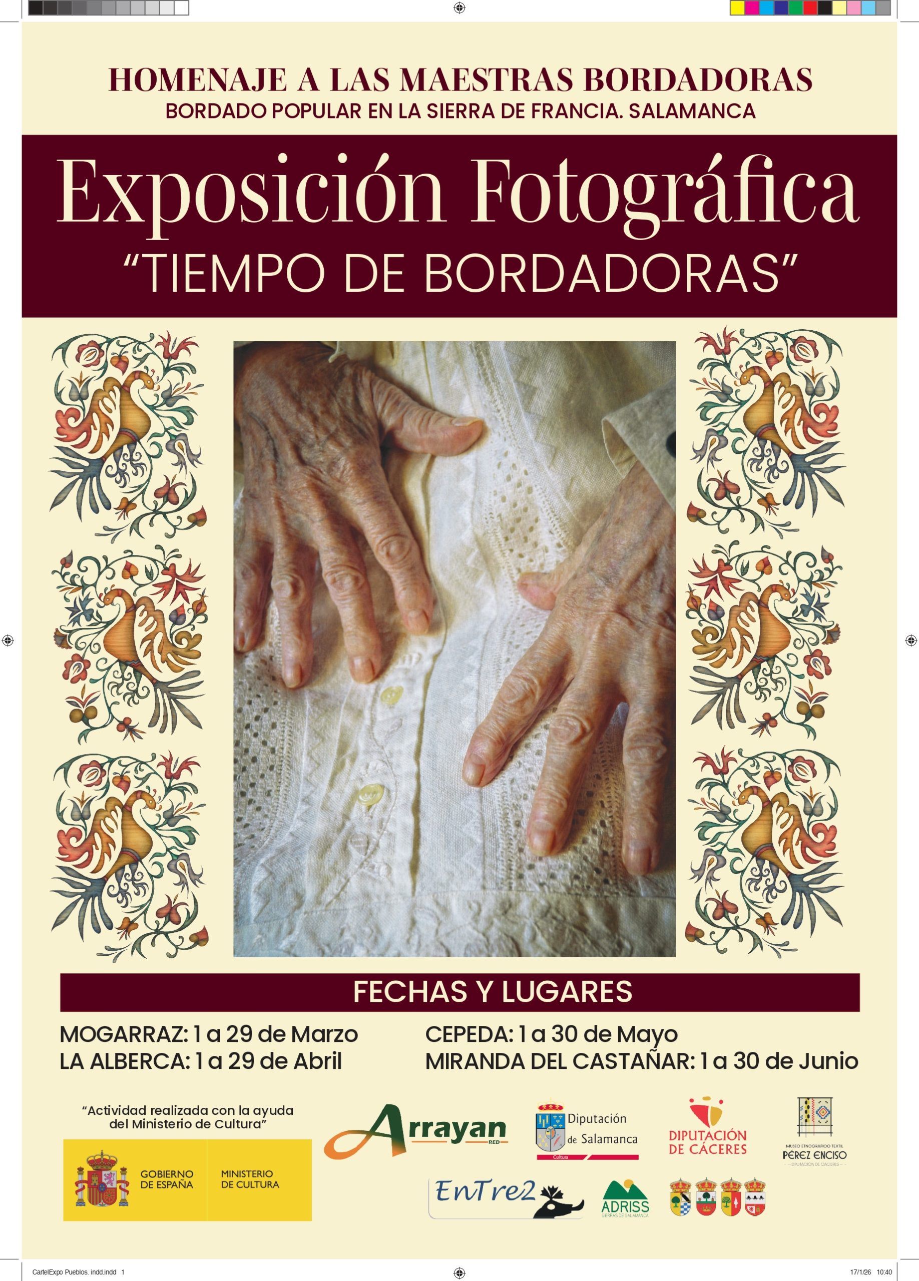 La exposición fotográfica “Tiempo de bordadoras. Bordado popular en la Sierra de Francia”, es un proyecto promovido por la Asociación Red Arrayán de Cultura, Patrimonio y Medio Ambiente que rinde homenaje a las mujeres que han mantenido viva esta manifestación cultural a lo largo de generaciones. La muestra, realizada en colaboración con el Área de Artes Visuales y Creación Contemporánea del Ministerio de Cultura, pone en valor a través de fotografías realizadas por Rosa Gómez Garcia experta en antropología visual a estas mujeres portadoras del Bordado Popular Serrano como una expresión cultural de carácter inmaterial ligada a la vida cotidiana, la memoria y la identidad del territorio.