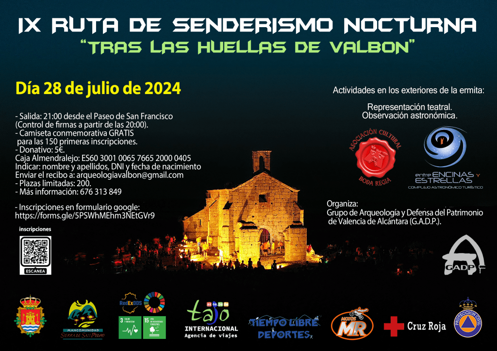 Con motivo de la celebración de la XX Jornadas Transfronterizas Boda Regia en Valencia de Alcántara tendrá lugar la X Edición de la Ruta de Senderismo Nocturna “Tras las Huellas de Valbón”, organizada por el grupo de Arqueología y Defensa del Patrimonio de Valencia de Alcántara, en colaboración con el Ayuntamiento de Valencia de Alcántara. La Ruta saldrá del Paseo de San Francisco y dará comienzo a las 21:00 horas, el control de firmas será a partir de las 19:30 horas. Las inscripciones se realizarán a través del formulario Google https://forms.gle/1kGG3Mse7xbiFtYc9 Camiseta conmemorativa GRATIS para las 150 primeras inscripciones. Actividad