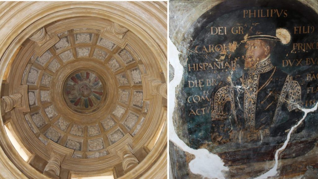 La restauración de las pinturas murales: El conjunto de pintura mural está formado por cuatro pinturas y una inscripción que recorre el tambor. De las cuatro pinturas tres son retratos que pertenecen al Obispo Juan González de Munébrega promotor de la obra, Carlos V, monarca del momento, y su hijo y heredero Felipe II, y la cuarta es un paisaje con representación simbólica de los poderes civil y religioso. Y los escudos del promotor: También se ha realizado la restauración integral de los cuatro escudos heráldicos del obispo Juan González de Munébrega ejecutados en madera policromada y dorada. ¿Qué se