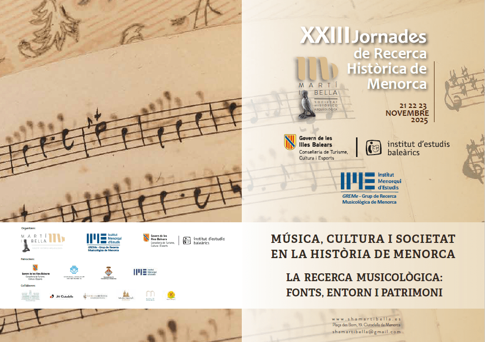 MÚSICA, CULTURA I SOCIETAT EN LA HISTÒRIA DE MENORCA. LA RECERCA MUSICOLÒGICA: FONTS, ENTORN I PATRIMONI. Ciutadella de Menorca, 21, 22 i 23 de novembre de 2025 La proposta d’aquestes jornades dedicades a la musicologia a Menorca neix com una iniciativa necessària per aprofundir en el coneixement i la difusió del patrimoni musical de l’illa. Amb l’objectiu de promoure la recerca acadèmica, impulsar la conservació i fomentar la interpretació del llegat sonor menorquí, aquestes jornades volen contribuir de manera significativa a la revalorització de la música com a part fonamental de la història i la cultura de Menorca. La propuesta