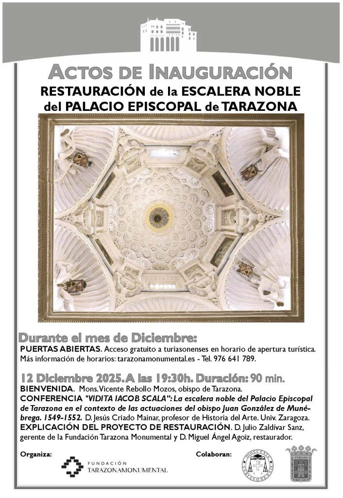 DURANTE EL MES DE DICIEMBRE: Acceso gratuito a los turiasonenses durante el horario turístico. Más información de horarios en: tarazonamonumental.es y Tel. 976 641 789. ACTO OFICIAL DE INAUGURACIÓN: Viernes 12 de diciembre a las 19:30h. Duración aproximada: 90 minutos. Bienvenida. Mons. Vicente Rebollo Mozos, obispo de Tarazona. Conferencia «VIDITA IACOB SCALA»: La escalera noble del Palacio Episcopal de Tarazona en el contexto de las actuaciones del obispo Juan González de Munébrega. 1549-1552. D. Jesús Criado Mainar, profesor de Historia del Arte. Universidad de Zaragoza. Explicación del proyecto de restauración: D. Julio Zaldívar, gerente y D. Miguel Ángel Agoiz, restaurador. Fundación Tarazona Monumental. Antes y después del acto oficial podrá