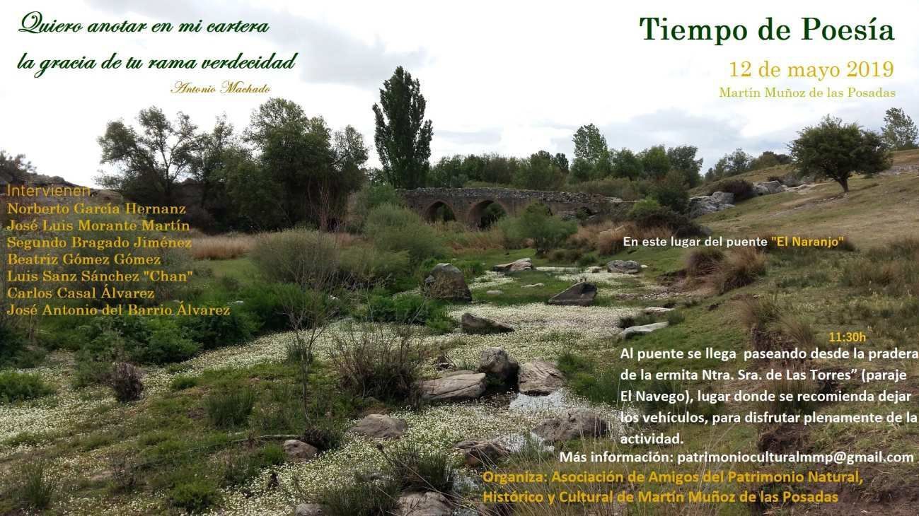 Con el nombre «Tiempo de Poesía», la Asociación de Amigos del Patrimonio Natural, Histórico y Cultural de Martín Muñoz de las Posadas promueve una actividad donde la protagonista es la poesía en el medio natural y los elementos del patrimonio cultural de nuestro entorno. Un número de poetas invitados leerán o recitarán la poesía de sus obras, las personas asistentes a la actividad, que previamente hayan reservado turno, también podrán intervenir; todos ellos, conocerán los elementos histórico – artísticos de la localidad y los rincones paisajísticos que le rodean.