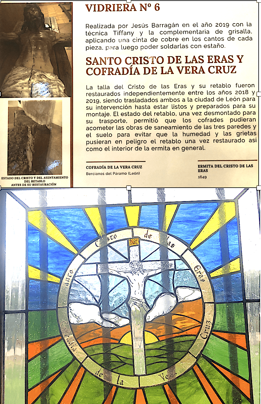 Con esta última vidriera queremos dejar constancia del nombre de la Cofradía y la intitulación al Cristo de las Eras de la ermita.